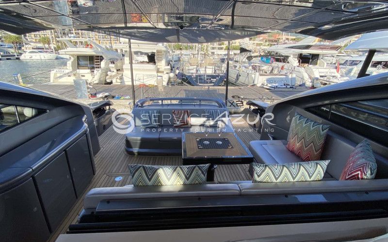 Особенностью Pershing 6X является просторная задняя терраса с баром, удобными сиденьями и зоной для принятия солнечных ванн, идеально подходящая для наслаждения морскими пейзажами и солнцем.