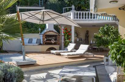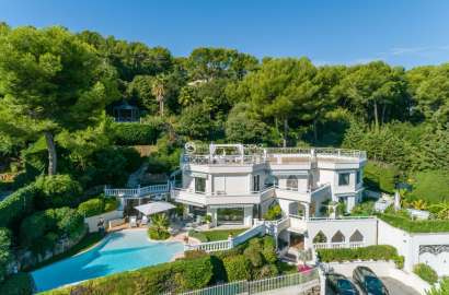 Comfortable luxury house of 500 sqm ideally located on the heights of Golfe Juan on a landscaped garden of 2500 sqm enjoying panoramic view of the sea, Cap d’Antibes and mountains. High-end equipped and furnished, the villa offers 6 bedrooms each with a bathroom, spacious living rooms, several terrasses, heated swimming pool (treated without chemical chlorine), Spa (Hammam, Jacuzzi and Sauna), Home Cinema. Located between Cannes and Antibes in a quiet and secure domain.
