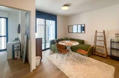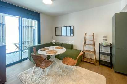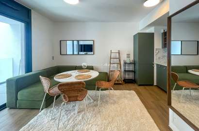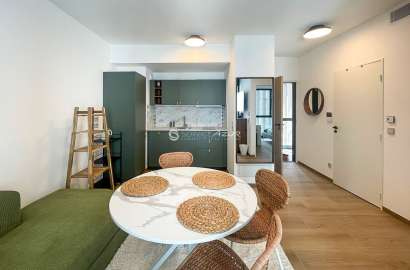 Offering 36 sqm of refined living space, the apartment features a bright 20 sqm living room with a fully equipped open-plan kitchen, one bedroom, and a modern bathroom. The living room opens onto a 5 sqm loggia. A private underground parking space is included.