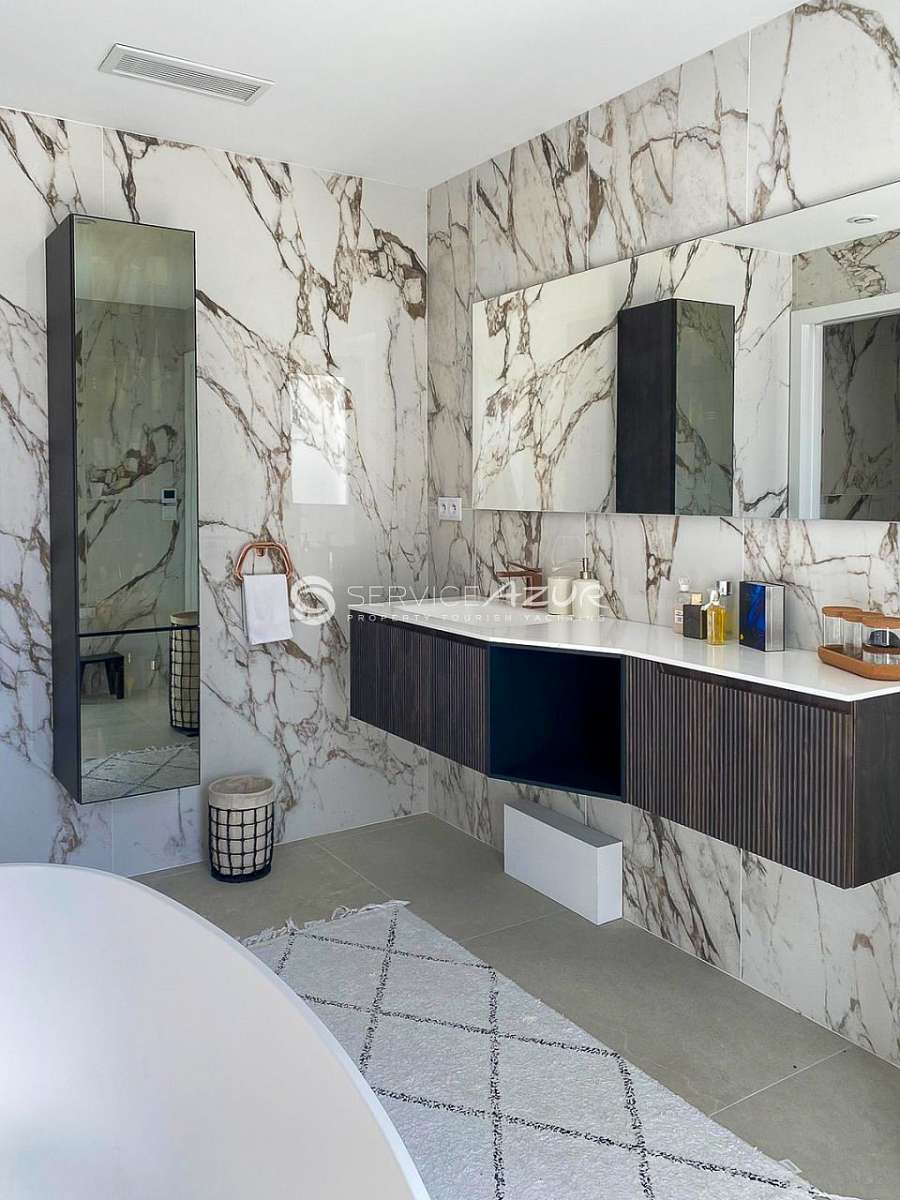 Тераса біля будинку 1000 кв.м. максимально облаштована для відпочинку на свіжому повітрі та насолодою морськими краєвидами: басейн із підігрівом та ефектом переливу, джакузі, літня кухня з барбекю та планчею. Ідеальний напрямок для відпустки на Французькій Рив'єрі !